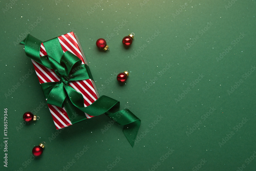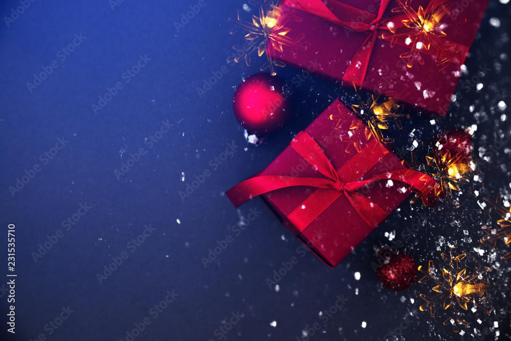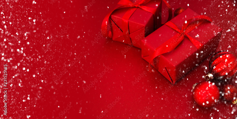 Merry Christmas and Happy Holidays greeting card, frame, banner. New Year. Christmas red handmade gifts, presents on red background. Winter holiday theme.