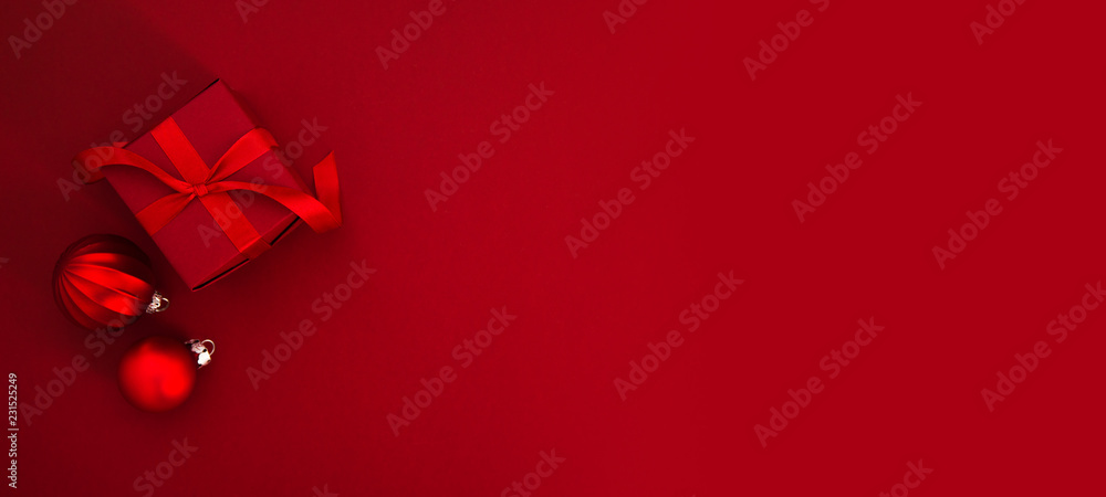Merry Christmas and Happy Holidays greeting card, frame, banner. New Year. Christmas red handmade gifts, presents on red background top view. Winter holiday theme.