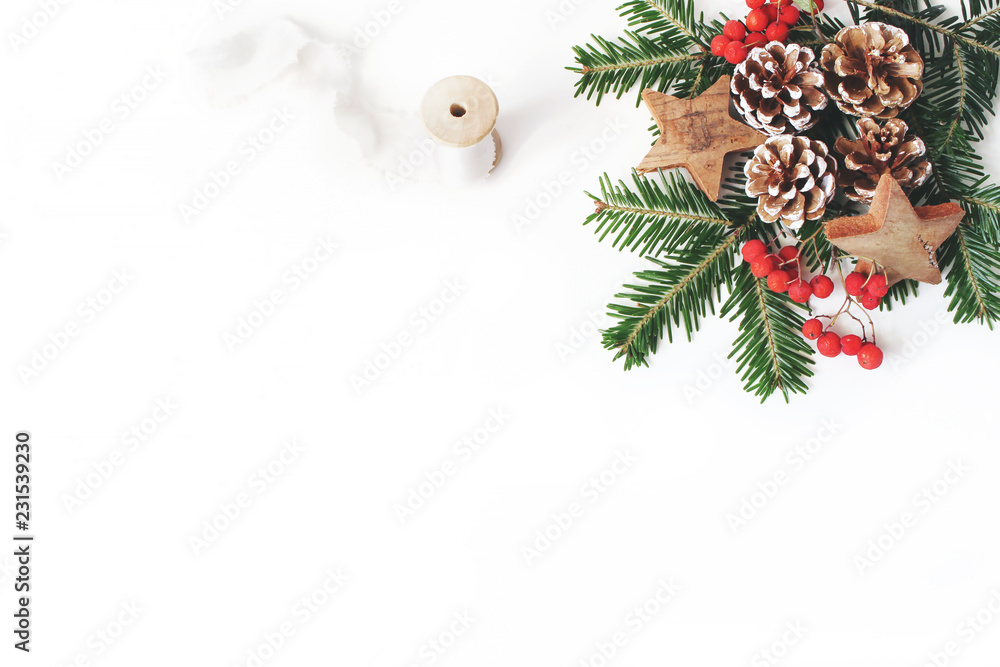 Christmas festive styled composition. Decorative banner. Pine cones, fir tree branches, red rowan berries, wooden stars and silk ribbon on white table background. Negative space. Flat lay, top view.