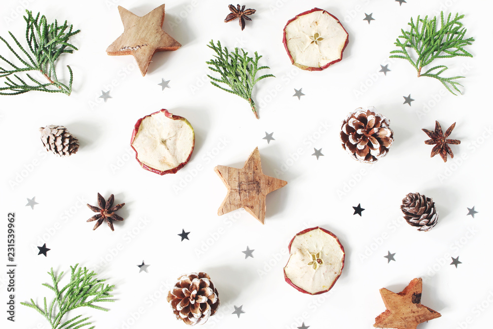 Christmas festive styled composition. Decorative pattern. Pine cones, dried apple fruit, cypress branches, anise, confetti and wooden stars isolated on white wooden background. Flat lay, top view