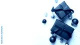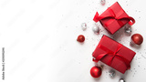 Merry Christmas and Happy Holidays greeting card, frame, banner. New Year. Christmas red handmade gifts, presents on red background top view. Winter holiday theme.
