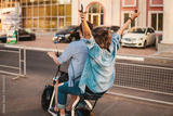 Lovely young couple driving electric bike during summer. Modern city dating and transportation