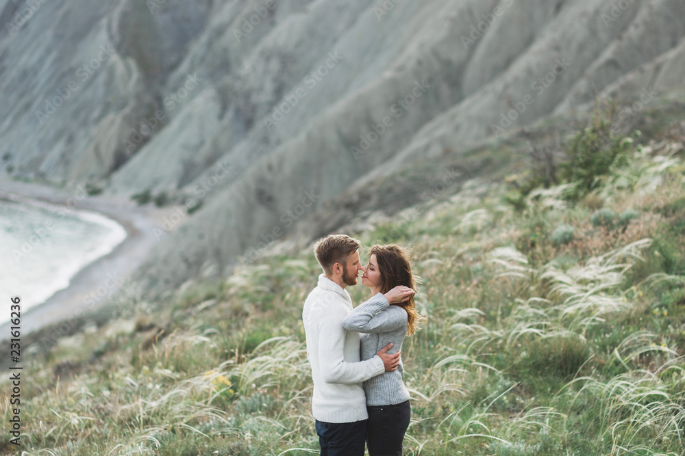 Young couple walking on nordic sea coast with mountain view in spring, casual style clothing sweaters and jeans