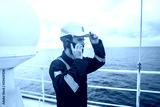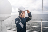 Marine Deck Officer or seaman on deck of vessel or ship . He is speaking on the mobile cell phone
