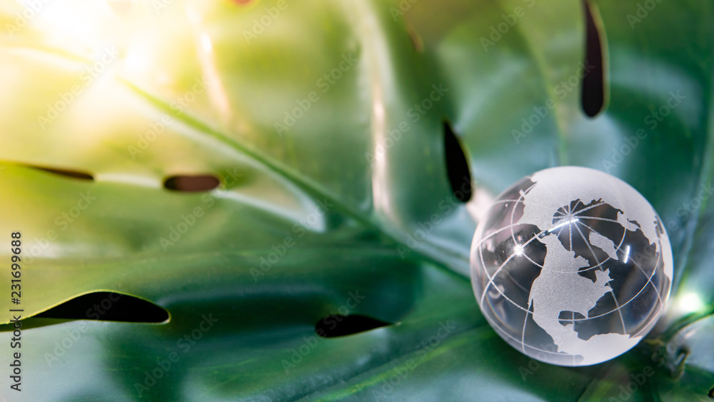 World globe cystal glass on green lush leaf. Environmental conservation. World environment day. Global business for sustainable development. Nature and ecology concept.