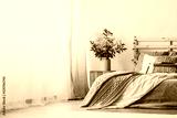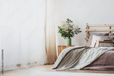 Trendy bedroom interior with comfortable bed with dirty pink bedding and beige warm blanket, real photo with copy space