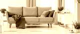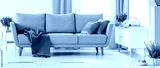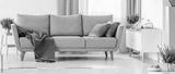 Grey couch with purple blanket and green pillows in real photo of white sitting room interior with fresh heathers and cupboard with bike shape clock