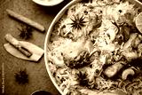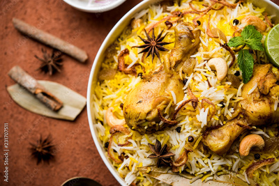 Delicious spicy chicken biryani in bowl over moody background, it’s a popular Indian and Pakistani food.