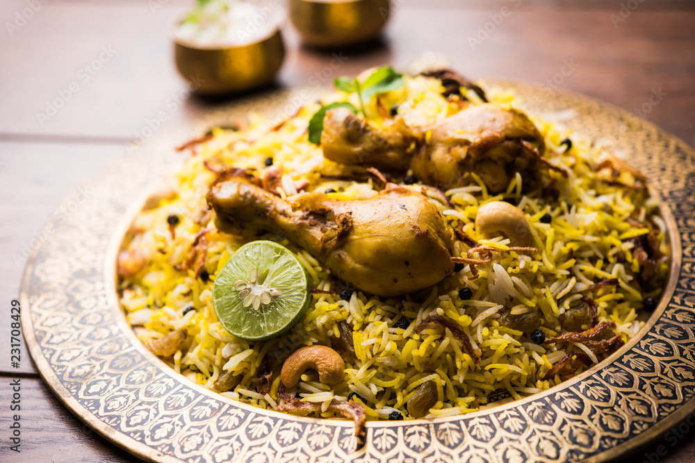 Delicious spicy chicken biryani in bowl over moody background, it’s a popular Indian and Pakistani food.