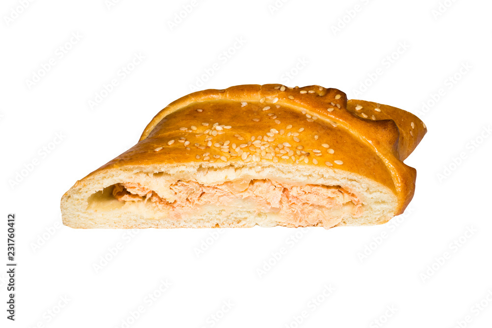 Ruddy fish pie on a white background.Pie with red fish.Fish pie.