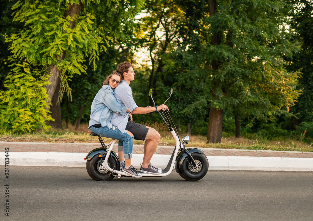 Lovely young couple driving electric bike during summer Modern city life and transportation