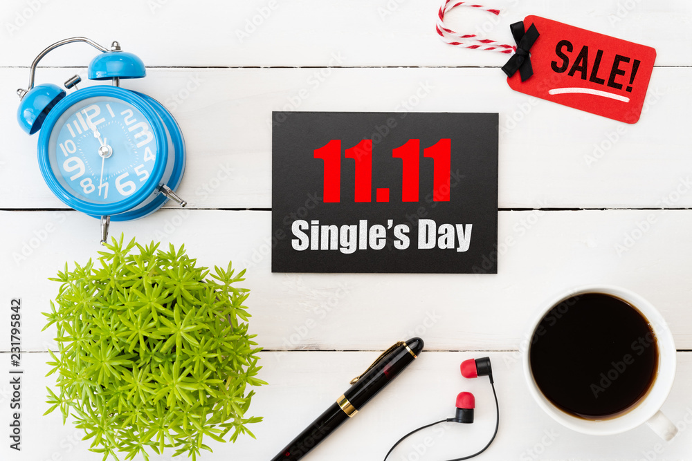 Online shopping of China, 11.11 single day sale concept. Red and black ticket with coffee cup, keyboard computer and mouse on white wooden background. Shopping concept.
