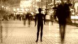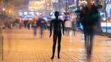 The black mannequin standing on the crowd street. evening time