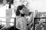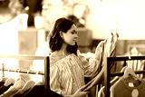 sale, shopping, fashion and people concept - happy young woman choosing clothes at vintage clothing store