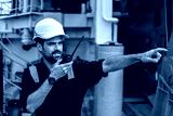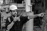 Marine Deck Officer or Chief mate on deck of vessel or ship . He holds VHF walkie-talkie radio in hands. Ship communication