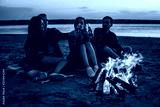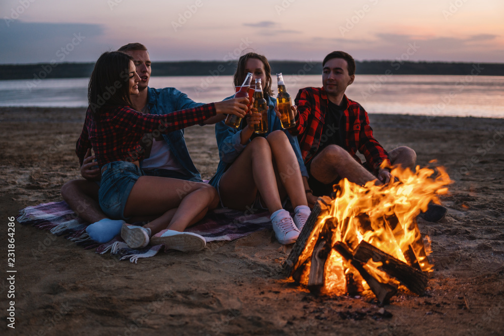 Camp on the beach. Group of young friends having picnic with bonfire. They drink beer