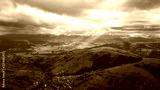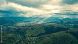 Aerial drone view of beautiful mountain valley with green pine trees and hills. Scenic landscape. Gloomy day. Sun rays trough the clouds