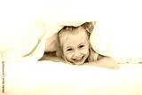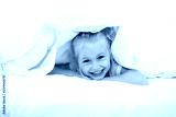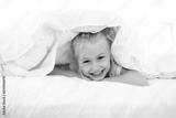 A Cheerful little girl in bed having fun