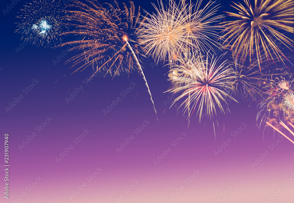 Colourful Fireworks on blue, pink, violet and purple twilight background with copy space to celebrate happy new year or special occasions, holidays event celebration concept in sweet love colour