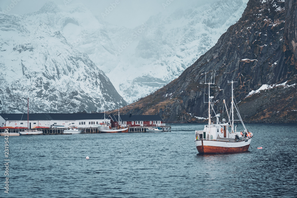 Ship in Hamnoy fishing village on Lofoten Islands, Norway