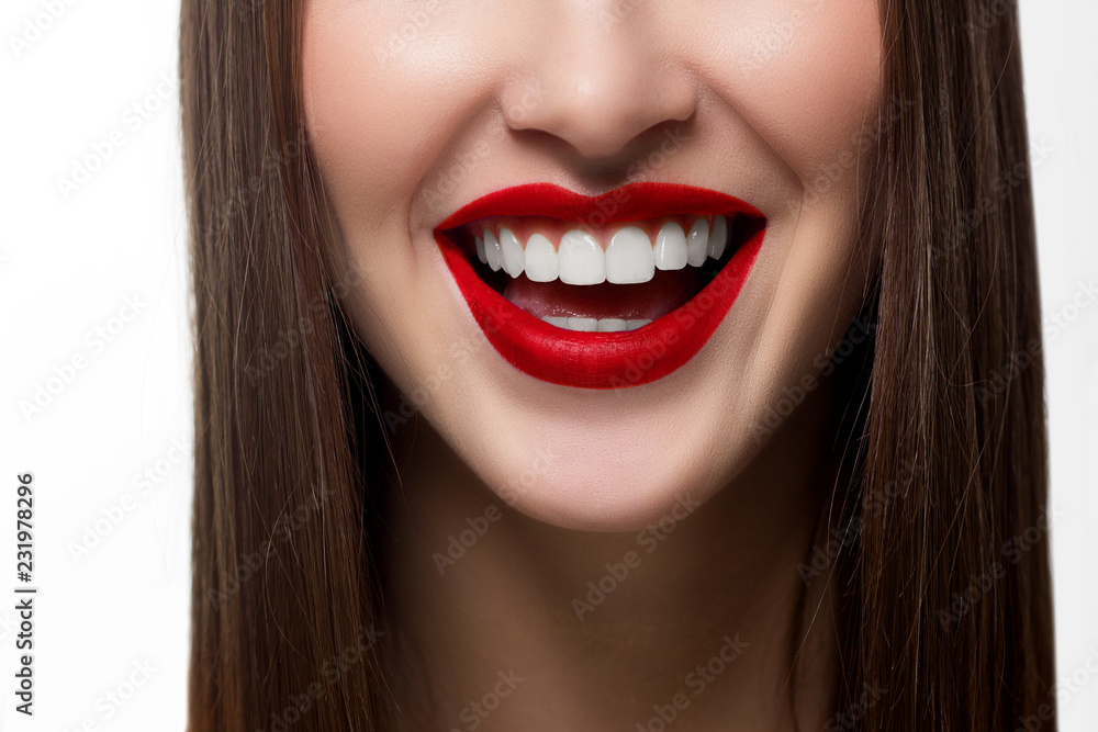 Close-up shot of sexy woman lips with red lipstick and white teeth. Perfect clean skin, fashion lip make-up. Beautiful spa portrait with tender pink flower. Spa and cosmetics