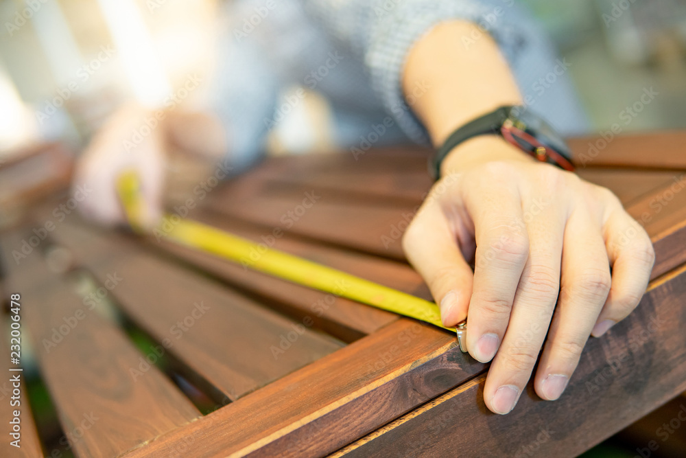 Young Asian man using tape measure for measuring wooden outdoor table in showroom. Shopping furniture for home improvement. Interior design concept