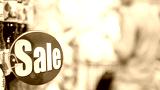 Red sale label on product shelf in supermarket with blurred male shopper choosing food package in the background. shopping lifestyle in grocery store concept