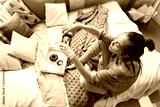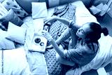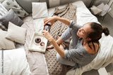 From above shot of woman sitting on bed and taking picture of tea and doughnut on tray with smartphone