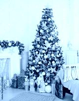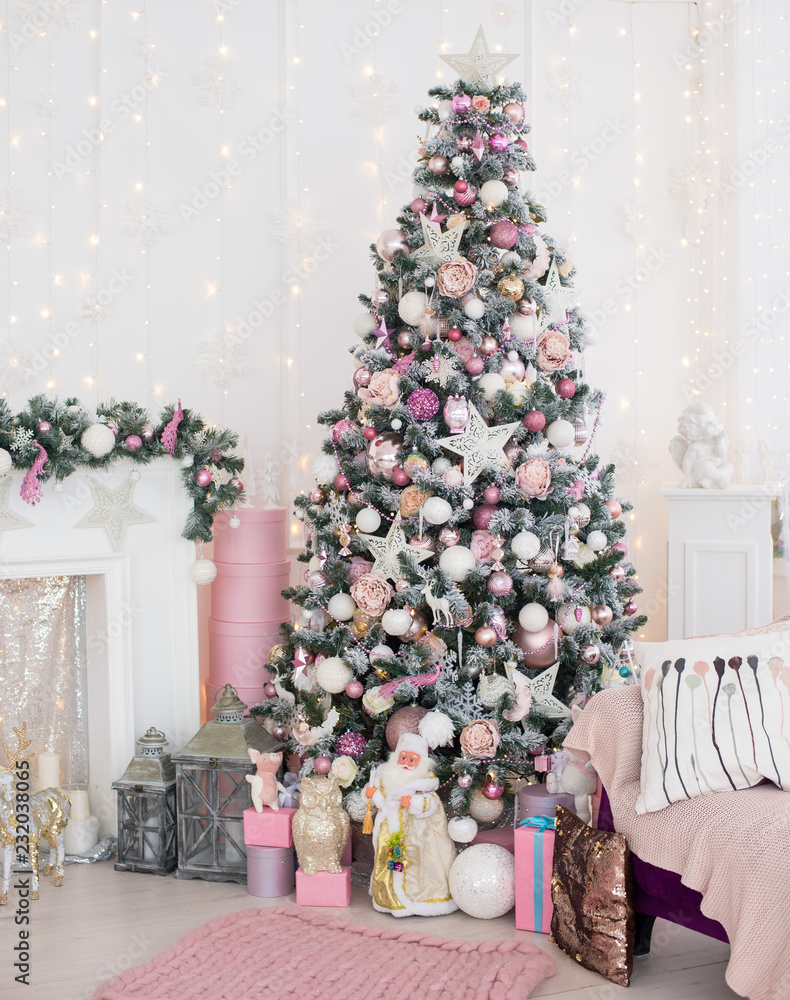 Christmas and New Year decorated pink interior room with presents and New year tree