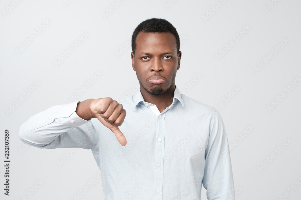 Unhappy, angry, mad and grumpy man giving thumbs down gesture