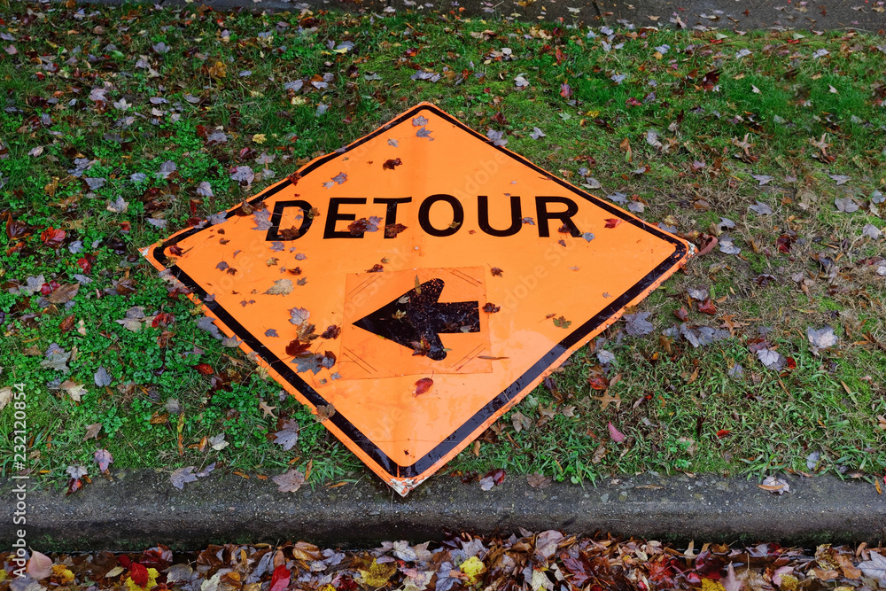 Wet orange road DETOUR sign with arrow on rainy grassy easement.
