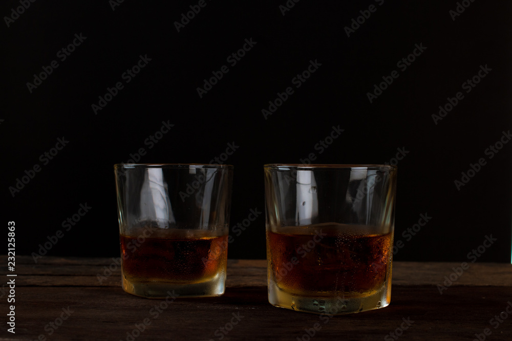Glass of alcohol scotch whiskey with ice on wooden table and black background
