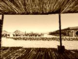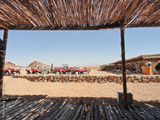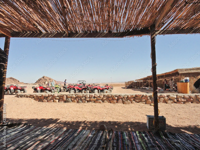 Bedouin village, view from the Bedouin dwellings with traditional rugs and thatched roof on the desert and ATVs.