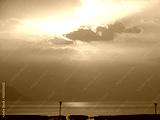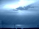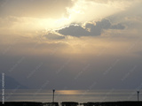 Seascape - sunset, the sun sets in the formidable storm clouds over the sea. Brutal, anxious colors of the sky and clouds.