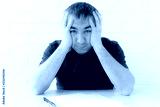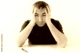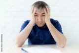 Thinking businessman touching his head holding a document sitting at the table.a man in business clothes sitting at the table and thinking about documents