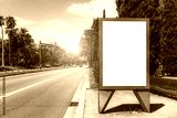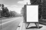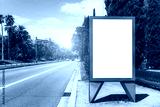 The template of an empty billboard placeholder near the highway with palms; blank urban advertising banner mockup; white empty information signboard near the road stretching into the vanishing point