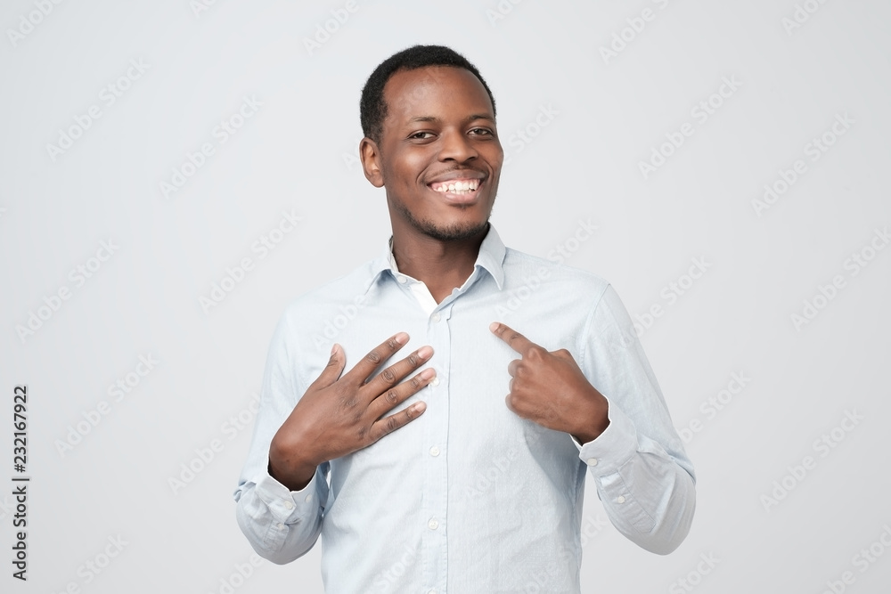 Portrait of proud handsome african man standing, looking at camera and pointing himself.