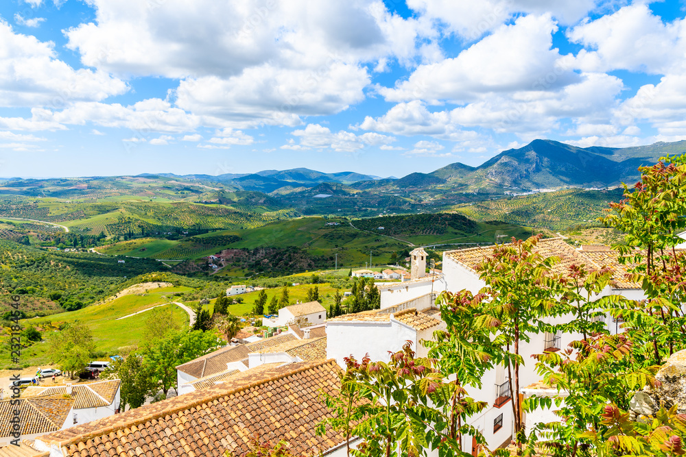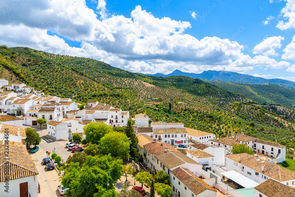 View of Zahara de la Sierra village with mountains in background, Grazalema National Park, Spain