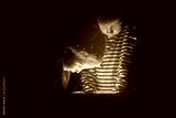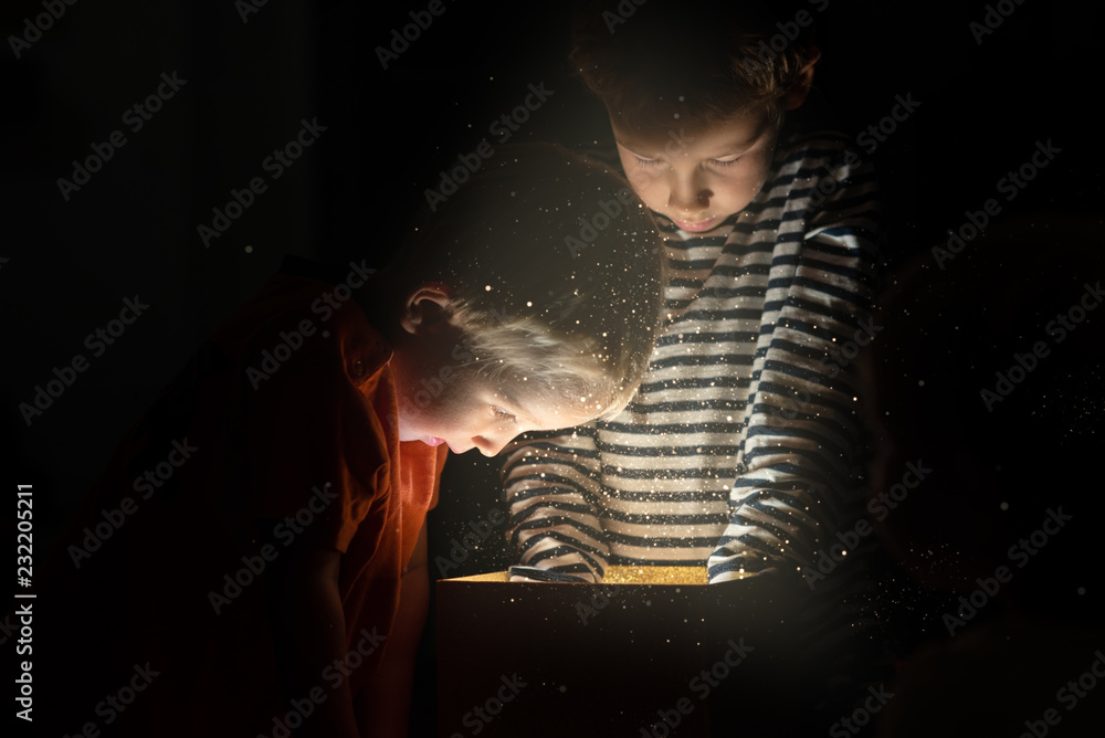 Two toddler boys standing over golden gift box with magical lights and glitters coming out