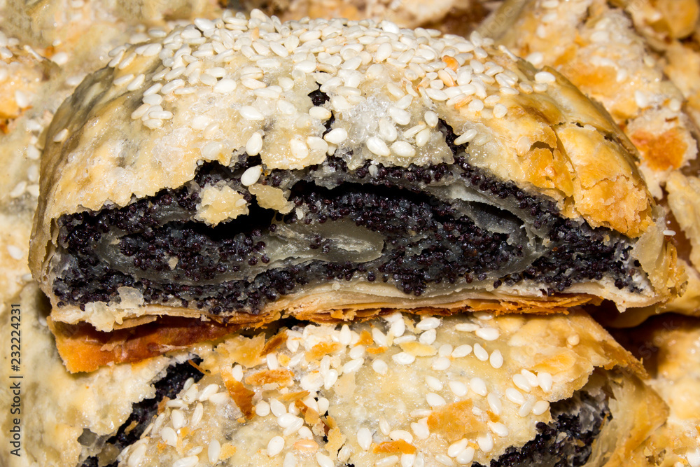 Pies with poppy seeds and sesame seeds.Background of pies with poppy seeds.