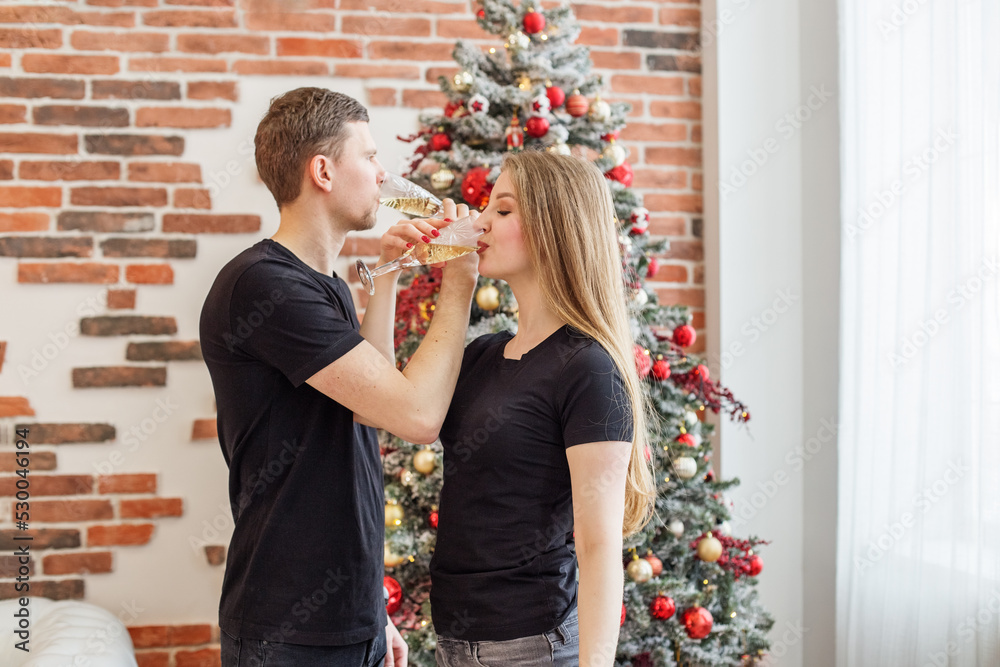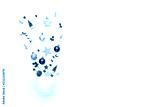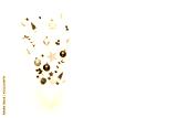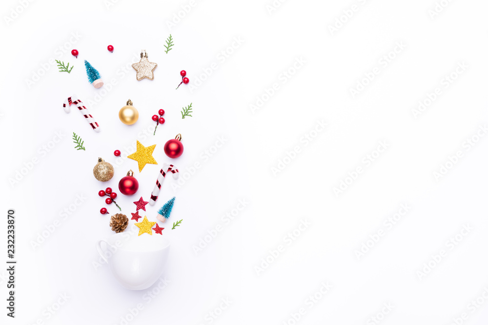 Christmas background concept. Top view of white cup splash out Christmas decoration with gift box spruce branches, pine cones, red berries and bell on white background.