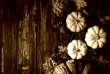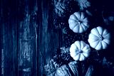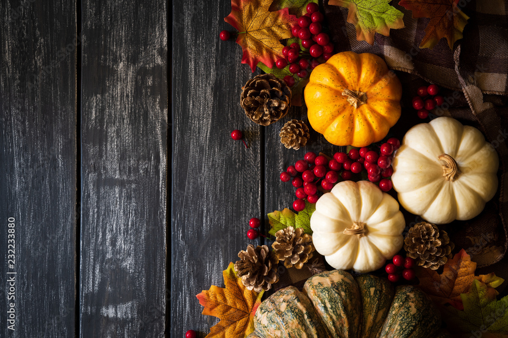 Top view of Autumn maple leaves with Pumpkin and red berries on old wooden background. Thanksgiving day concept.