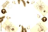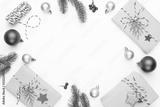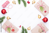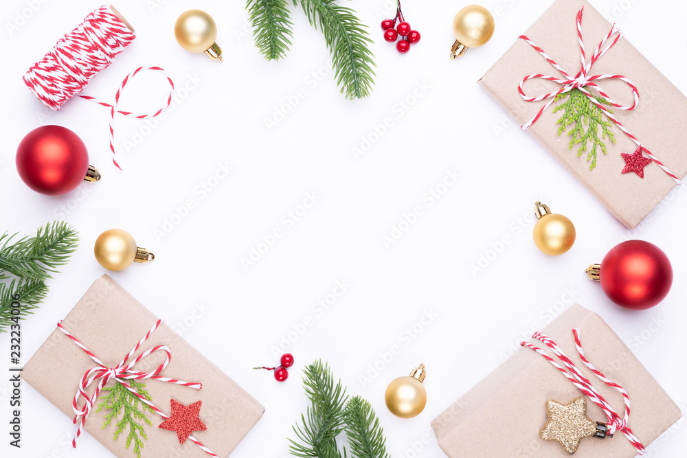 Christmas background concept. Top view of Christmas gift box red sock with spruce branches, pine cones, red berries and bell on white background.