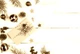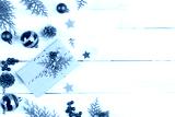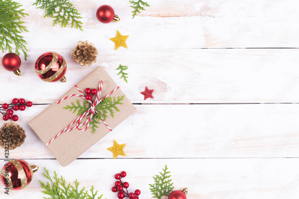 Christmas background concept. Top view of Christmas gift box with spruce branches, pine cones, red berries and bell on white wooden table background.