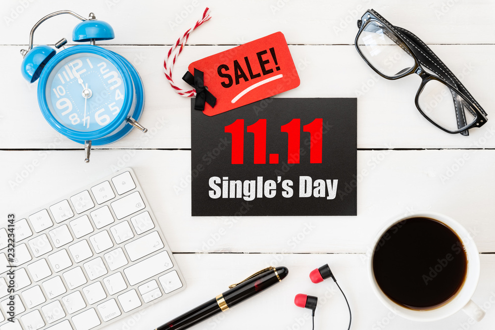 Online shopping of China, 11.11 single day sale concept. Red and black ticket with coffee cup, keyboard computer and mouse on white wooden background. Shopping concept.