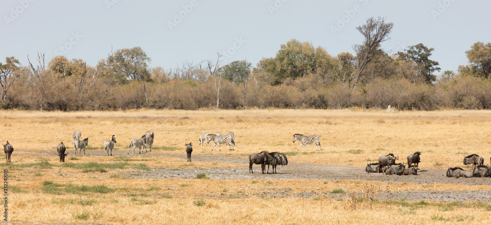 Large group of different animals close to a waterhole