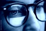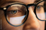 vision, business and education concept - close up of woman eyes in glasses looking at computer screen