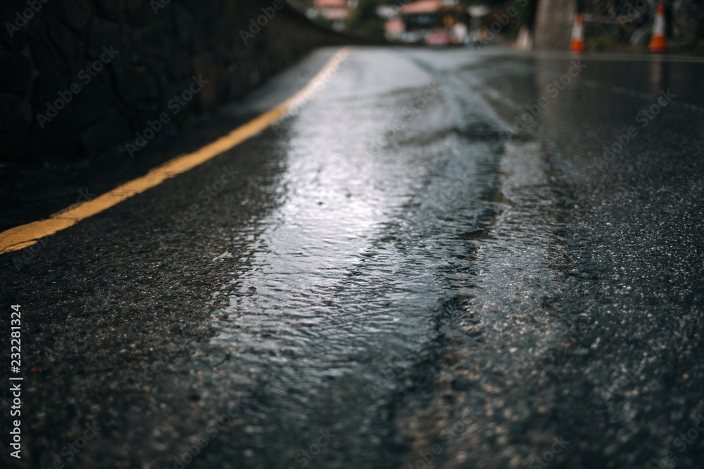 Reflections in the water on the street after rain. Wet asphalt after rain