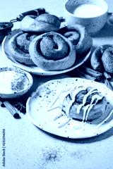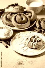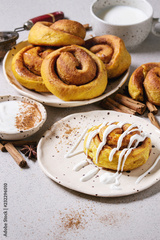 Homemade pumpkin cinnamon bun rolls sweet autumn baked dessert with cream cheese sauce in spotted ceramic plates with cinnamon sticks over white marble table.