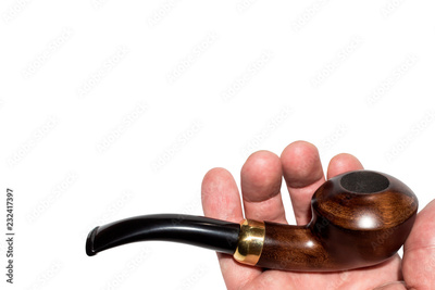 Smoking pipe made of wood in hand on white background.